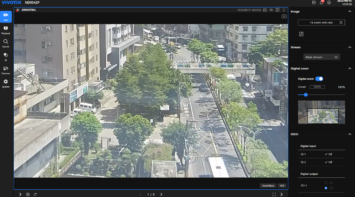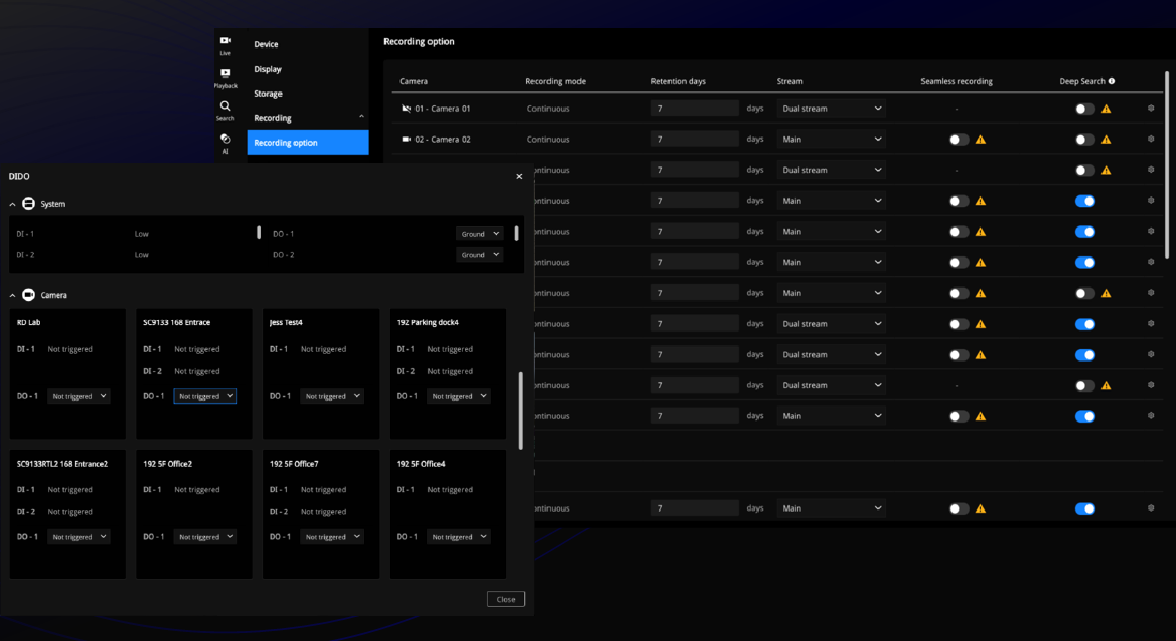 Una interfaz más inteligente y organizada consolida los ajustes de grabación, DI/DO y sincronización en un solo lugar. Los ajustes de alarma se presentan en un diseño tipo tarjeta para una visibilidad rápida, mientras que una ventana emergente muestra al instante información detallada sin necesidad de clics adicionales.